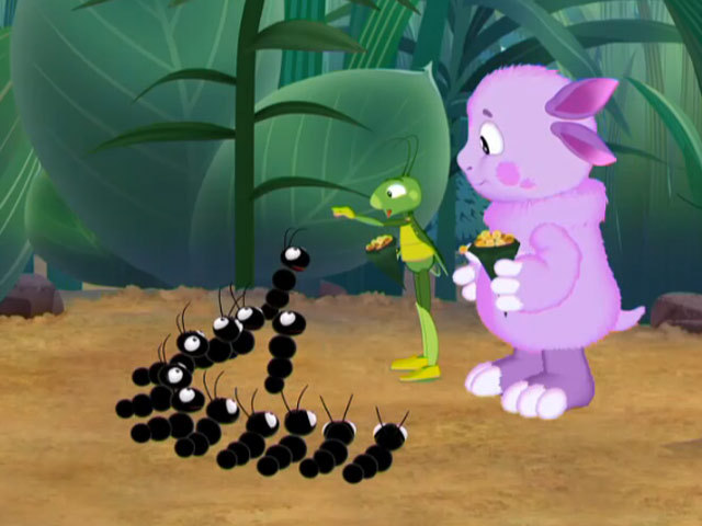 Лунтик с Кузей поспорили с гусеницами — кто лучше выучит червячков делать разные трюки.