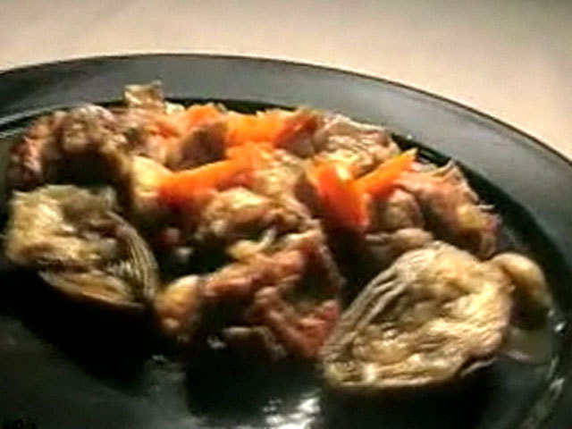 Рецепт приготовления мяса.Состав:мясо — 400 гр;шампиньоны — 10 грибов;морковь — 2 штуки;лук — 1 штука;артишок — 2 штуки;соль, перец, масло.