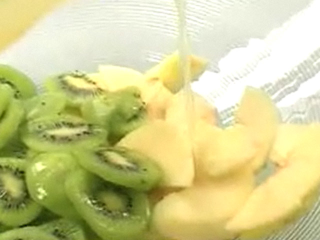 Рецепт салата из куриного мяса.Состав:куриная грудка — 2 кусочка;киви — 4 штуки;яблоко — 1 штука;эндивий, лимонный сок, майонез, кукуруза, масло.